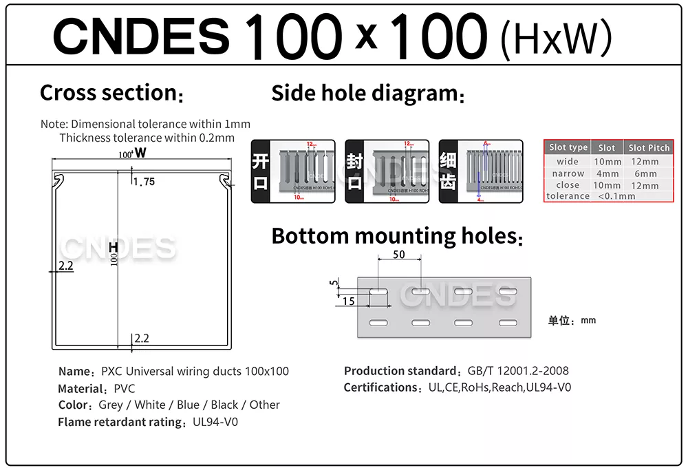Optimizați-vă proiectele de cablare cu canalele noastre de cabluri personalizate 100×100 pentru managementul firelor. În calitate de producător și furnizor lider de jgheab PVC din China, CNDES oferă soluții de încredere, de înaltă precizie și personalizabile pentru toate nevoile dumneavoastră de gestionare a cablurilor. Avem toate specificațiile pentru canale de sârmă (tăvi de cablu). Dacă aveți nevoie de alte specificații, vă rugăm să nu ezitați să ne contactați!