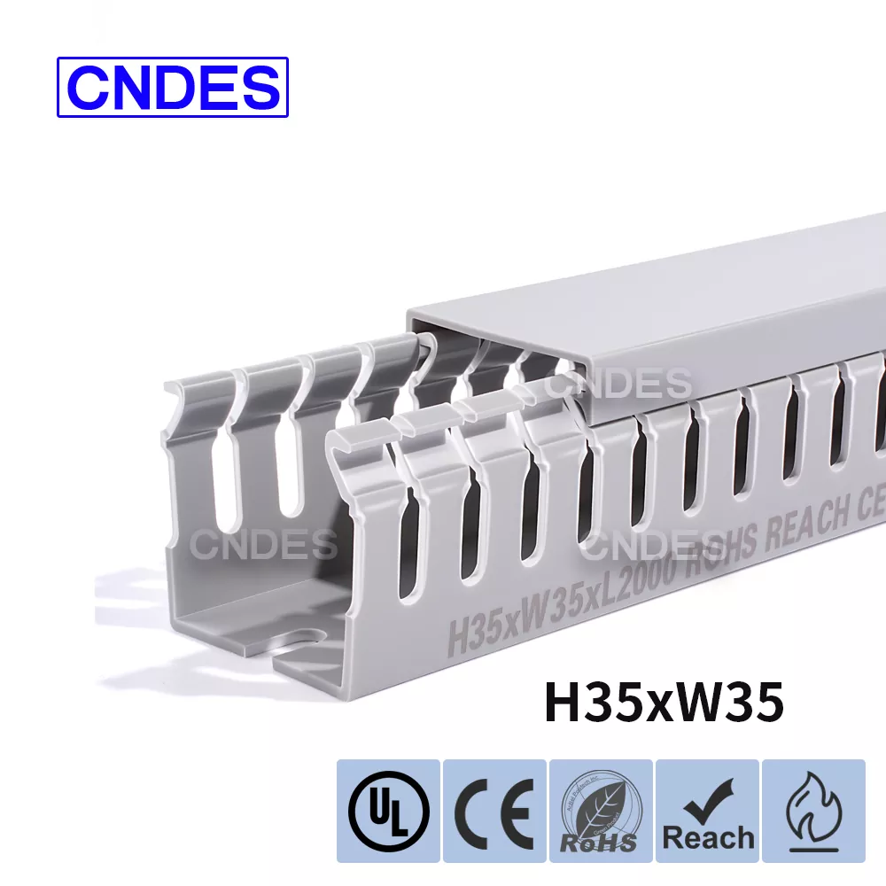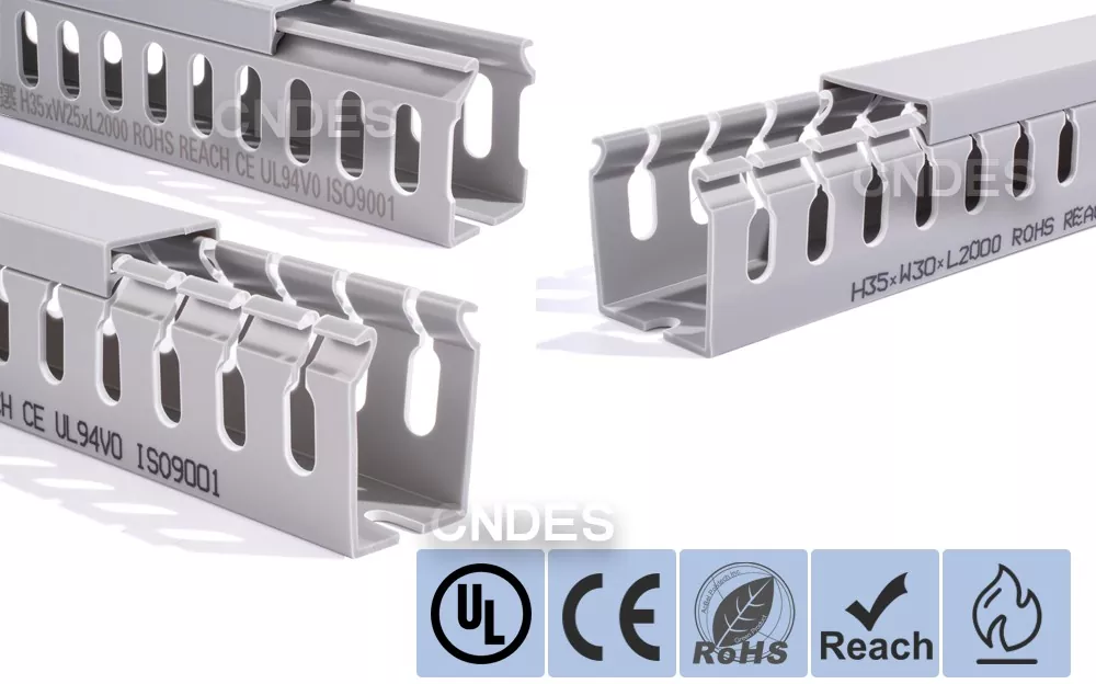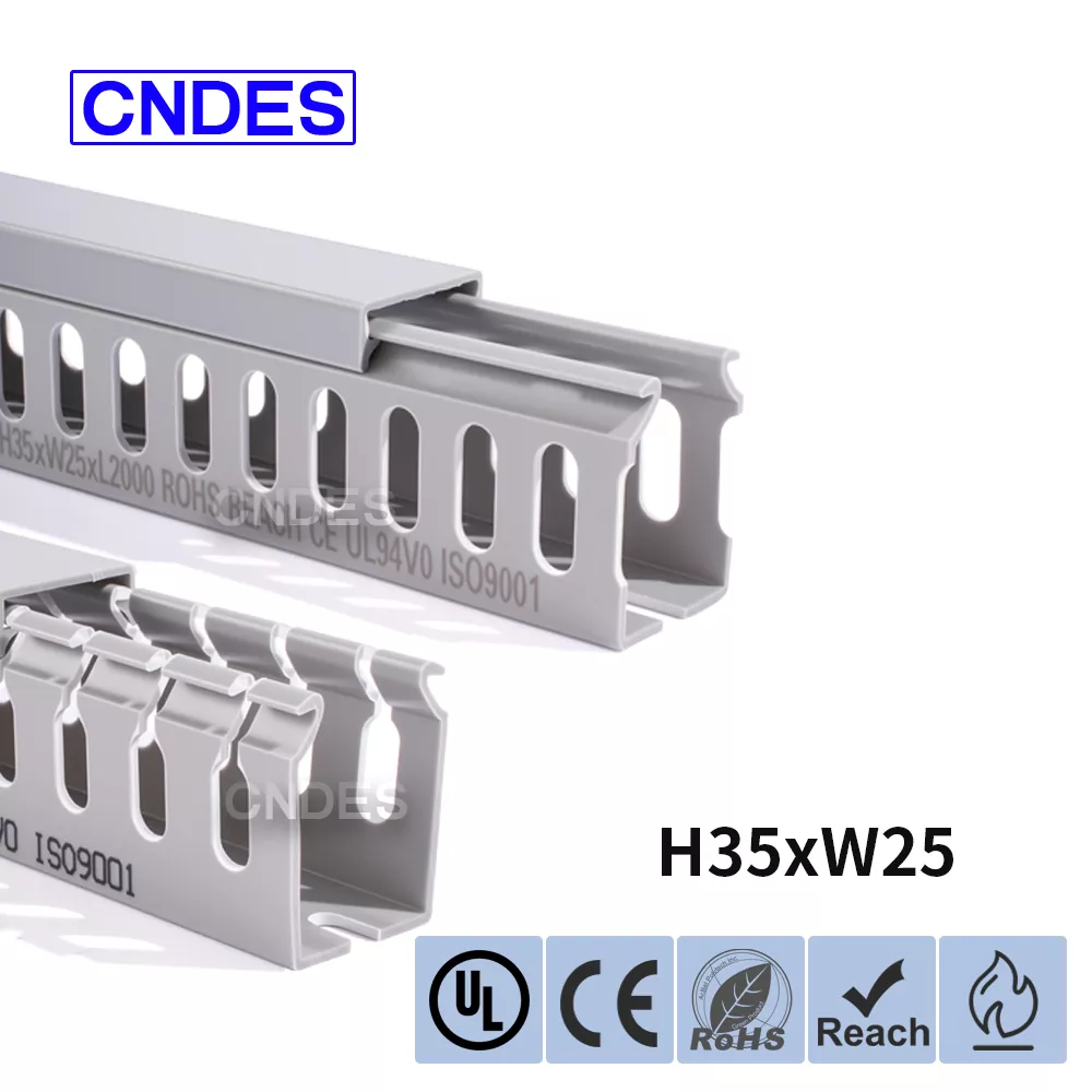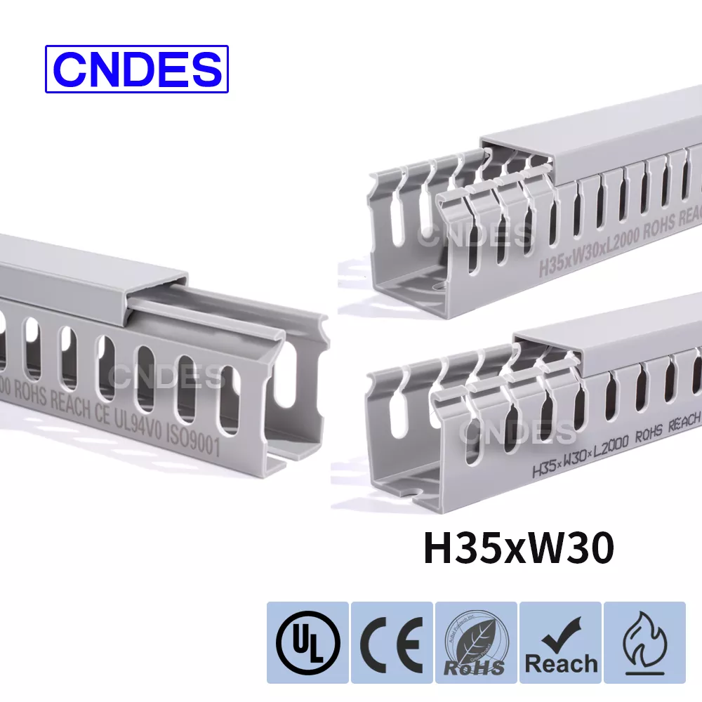 Conducta personalizată de dirijare a sârmei din PVC cu înălțime de 35 mm, fabricată de compania chineză CNDES, constă dintr-o bază rigidă din PVC și un capac detașabil. Baza prezintă șanțuri echidistante asemănătoare degetelor ștanțate pe ambele părți, formând „dinți de pieptene”. Acești dinți pot fi sparți cu mâna, permițând firului să iasă orizontal din orice poziție. Husa se fixează cu ușurință la loc, păstrând un aspect îngrijit. Un rând de găuri de montare în partea inferioară este conformă cu distanța standard DIN 43659. Poate fi fixat rapid pe panouri, cadre dulap sau structuri similare folosind șuruburi sau nituri M5.