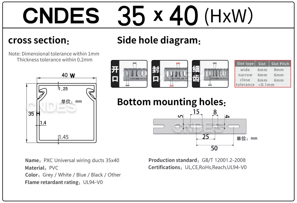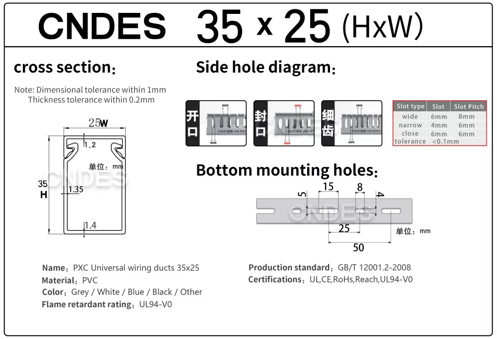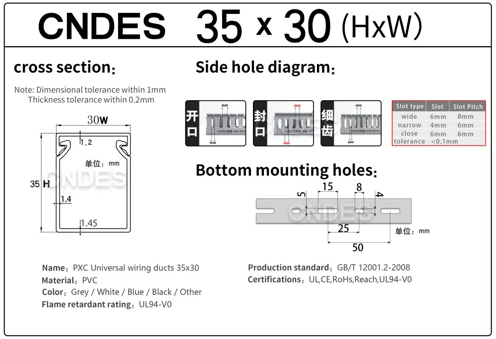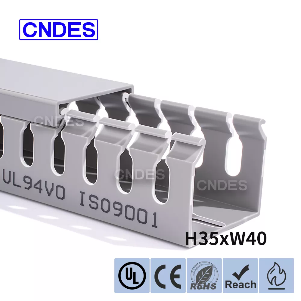 Conducta personalizată de dirijare a sârmei din PVC cu înălțime de 35 mm, fabricată de compania chineză CNDES, constă dintr-o bază rigidă din PVC și un capac detașabil. Baza prezintă șanțuri echidistante asemănătoare degetelor ștanțate pe ambele părți, formând „dinți de pieptene”. Acești dinți pot fi sparți cu mâna, permițând firului să iasă orizontal din orice poziție. Husa se fixează cu ușurință la loc, păstrând un aspect îngrijit. Un rând de găuri de montare în partea inferioară este conformă cu distanța standard DIN 43659. Poate fi fixat rapid pe panouri, cadre dulap sau structuri similare folosind șuruburi sau nituri M5.