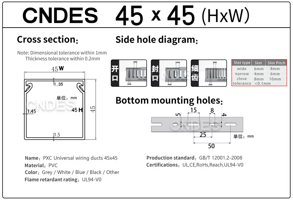 Vă prezentăm conducta personalizată de acoperire a sârmei din PVC cu înălțime de 45 mm de la CNDES, soluția dvs. ideală pentru gestionarea eficientă a cablurilor într-o varietate de aplicații. Indiferent dacă proiectați un nou panou electric, îmbunătățiți configurația cablajului mașinii sau îmbunătățiți sistemul electric al casei dvs., conducta noastră de acoperire cu sârmă din PVC cu fante în înălțime oferă echilibrul perfect între funcționalitate și aspectul estetic.