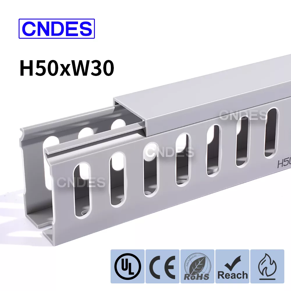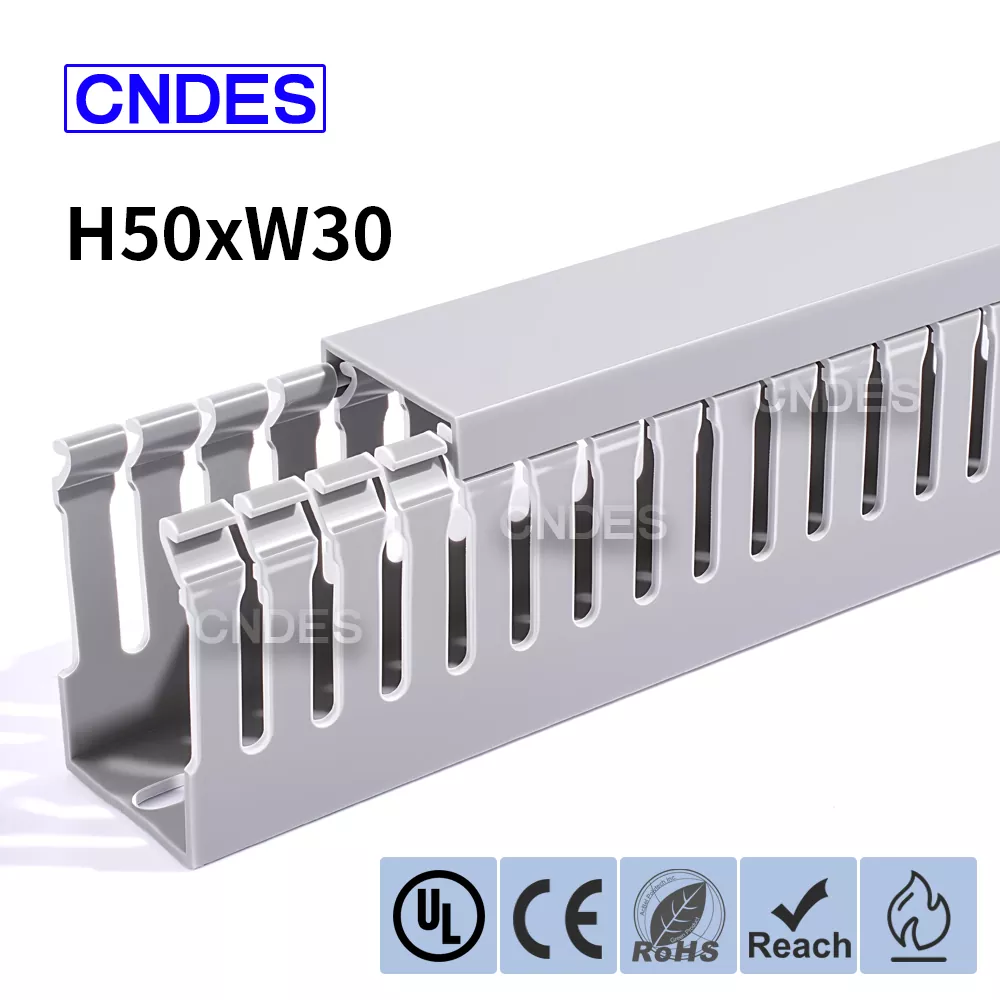 Conducta de organizare a cablurilor PVC cu fante de calitate 50×30 de la CNDES este o soluție compactă și eficientă pentru gestionarea cablurilor în spații înguste, cum ar fi dulapuri de control mici, carcase de date și cutii de joncțiune pentru echipamente. Această conductă de cablare cu profil subțire permite instalatorilor să organizeze, să separe și să protejeze cablurile fără a ocupa spațiu excesiv pe panou.