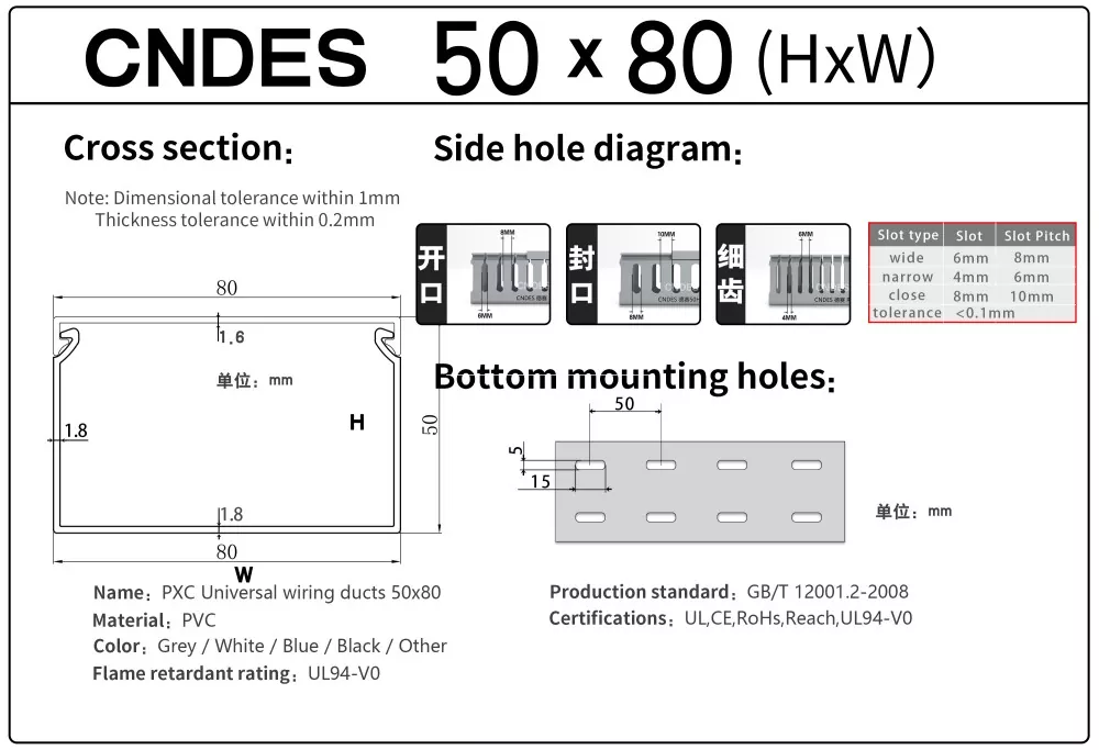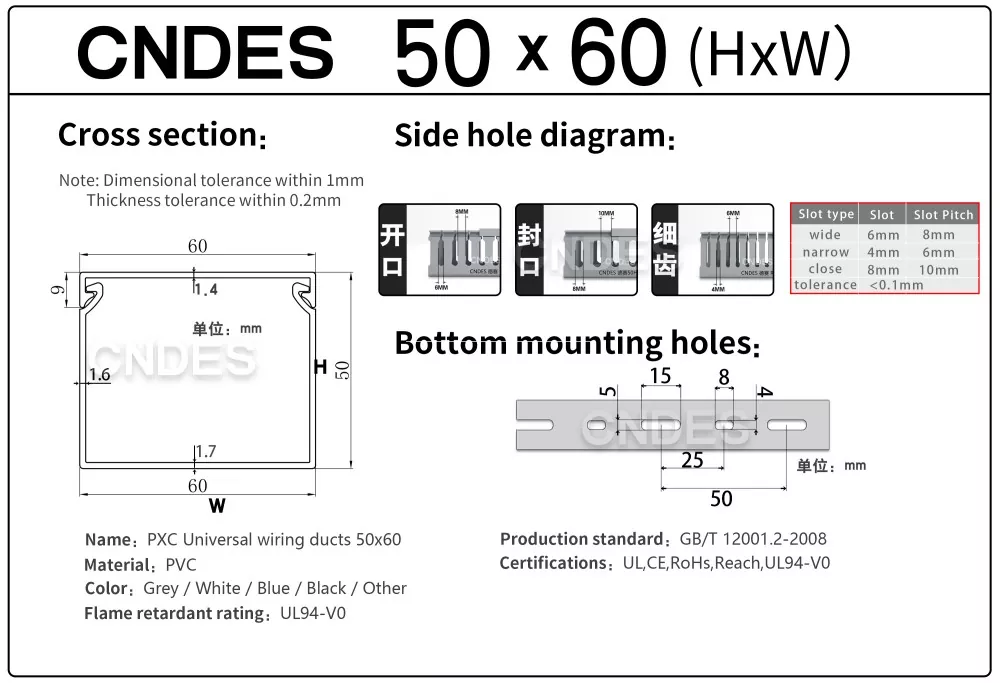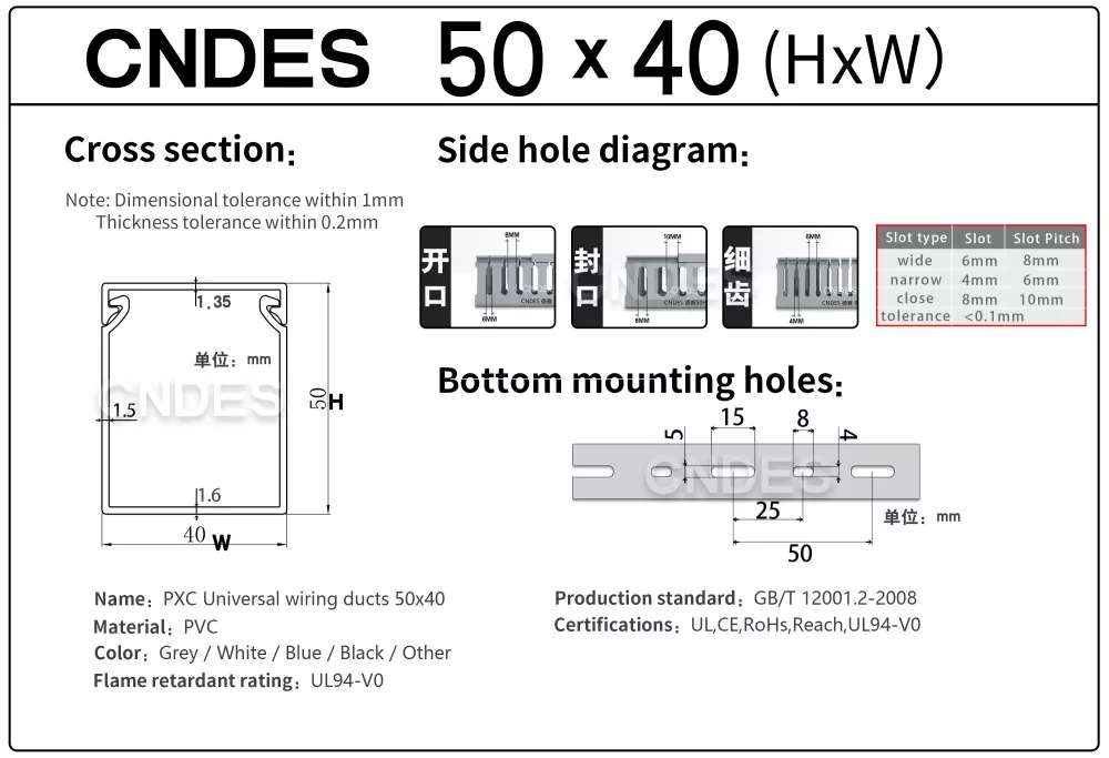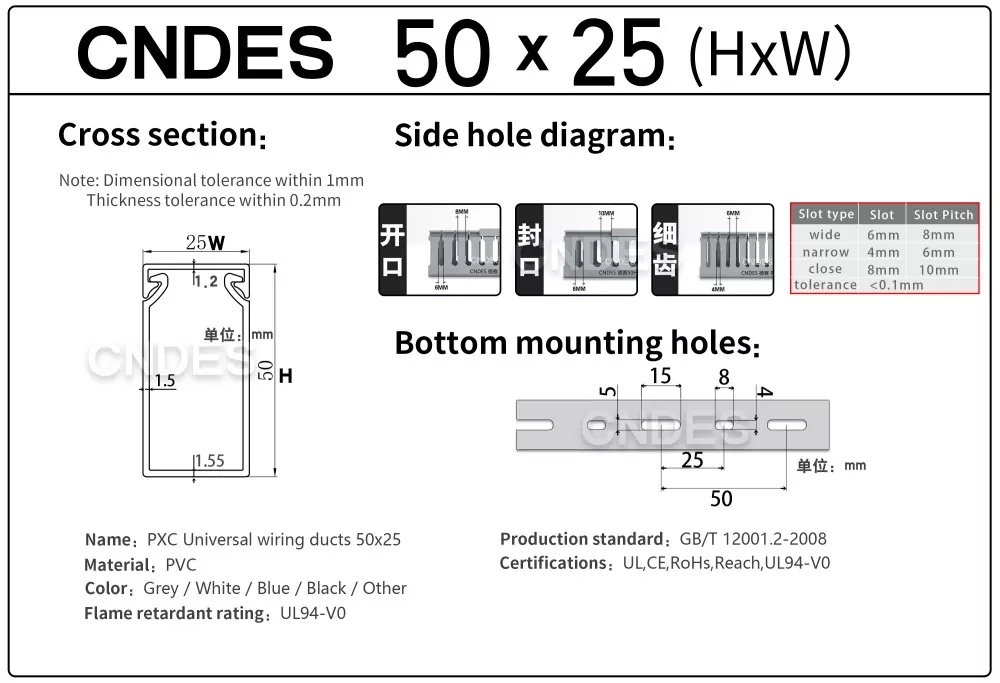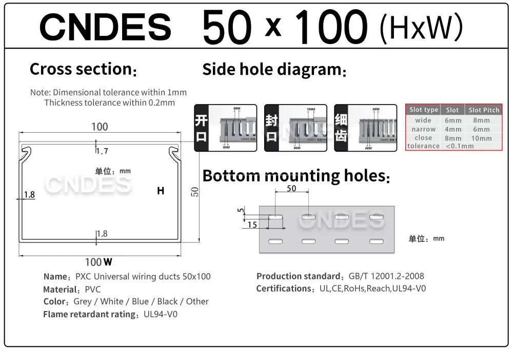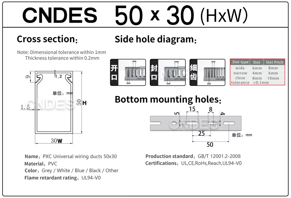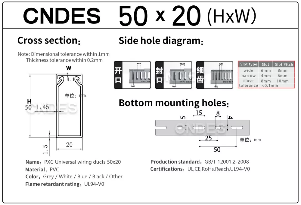 CNDES este un producător și furnizor specializat în furnizarea de conducte de cablare cu panouri din PVC cu fante. Aici vom prezenta canalul nostru de cablare de 50 mm înălțime, inclusiv următoarele specificații: 50*20,50*25,50*30,50*35,50*40,50*45,50*50,50*55,50*60,50*80,50*100.